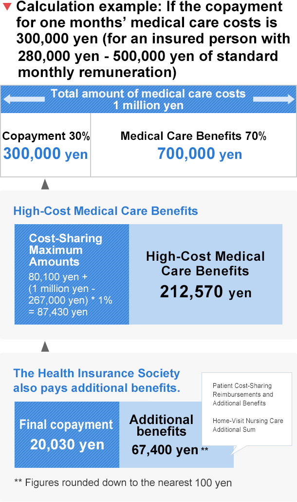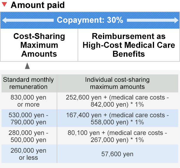 Your copayment for medical care costs is capped. If your copayment calculated based on certain standards exceeds the maximum, the excess amount will be paid as “High-Cost Medical Care Benefits”.