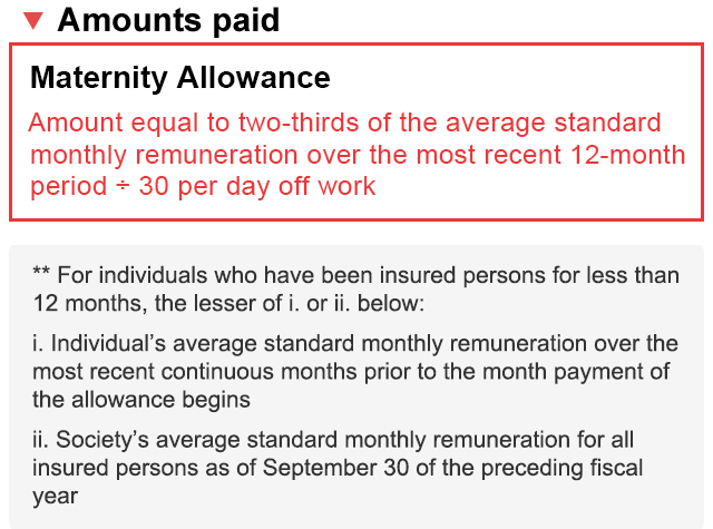 When a female insured person takes time off from work for childbirth, she is paid two-thirds of her average standard monthly remuneration over the most recent 12-month period ÷ 30 per day off to help cover living costs during that period. This benefit is referred to as “Maternity Allowance”.