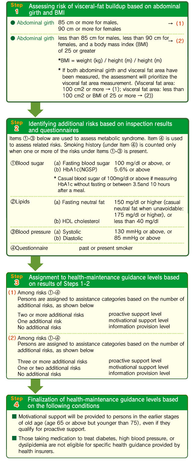 Specific health checkups services are provided for all insured persons and dependents aged 40-74. Specific health checkups is intended to identify persons requiring specific health guidance to decrease the numbers of people having, or at risk for, metabolic syndrome.