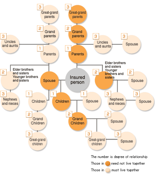 The scope of family members eligible to be certified as dependents is legally defined. Conditions for dependent eligibility also vary depending on whether or not the family member lives with the insured person.