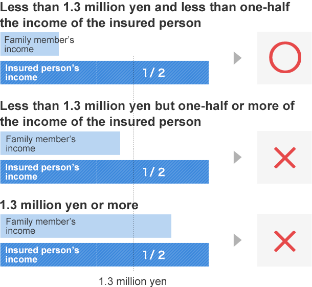 | If the family member lives with the insured person | If the family member lives apart from the insured person | The family member's annual income must be less than 1.3 million yen (1.5 million yen if aged 19-22* [not including the insured person's spouse]; 1.8 million yen if aged 60 or above or with a disability eligible for receipt of Disability Employees' Pension benefits) and must be less than one-half the income of the insured person. | The family member's annual income must be less than 1.3 million yen (1.5 million yen if aged 19-22* [not including the insured person's spouse]; 1.8 million yen if aged 60 or above or with a disability eligible for receipt of Disability Employees' Pension benefits) and must be less than the amount of the allowance sent to the family member from the insured person. |