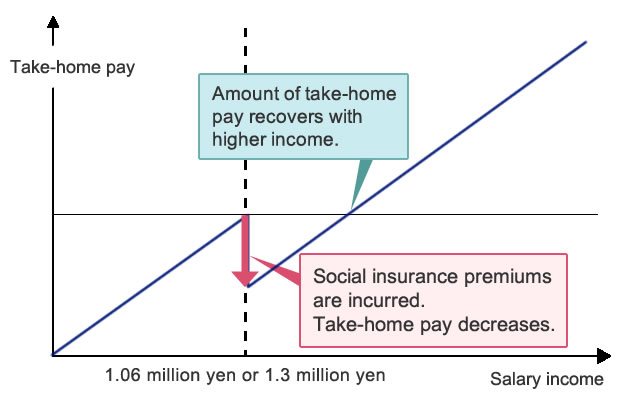 One of two different annual income barriers applies for social insurance premiums, depending on company size and other factors: 1.06 million yen or 1.3 million yen.