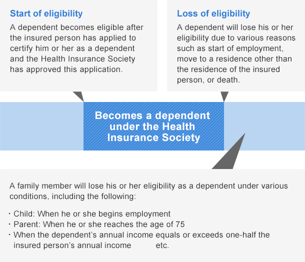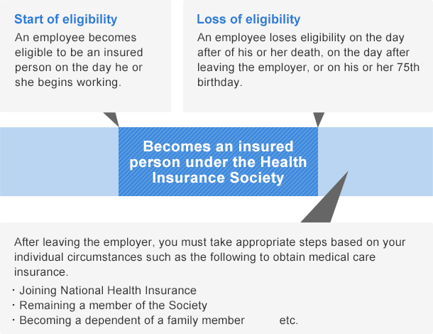 Eligibility for health insurance begins on the first day of employment and ends the day after the employee dies or leaves the employer. If a person becomes an insured person under the Medical Care System for the Advanced Elderly - for example, upon reaching age 75 - he or she will lose eligibility as an insured person under the health insurance program, even if still employed.