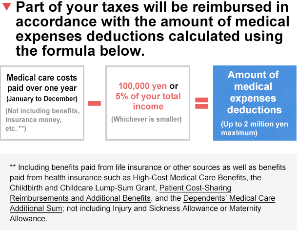 Medical expenses deductions are part of a system whereby if the amount of medical care costs paid in one year, including those of family members, exceeds a certain standard, you can file a final tax return with the tax office to have the excess amount of medical care costs deducted from your taxable income and have some of your taxes refunded.